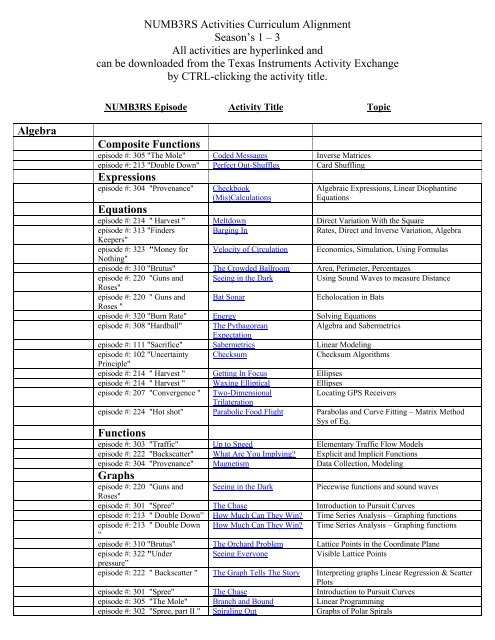 Yet millions of people hear this line every week at the beginning of the popular CBS show Numb3rs which features a young math professor as a crime fighter. If you search for Numb3rs youll see that all of the old activities are still available. Unfortunately the curriculum alignment for each episode seemingly disappeared into the abyss with the rest of the WAUMED site.